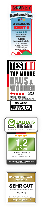 Willkommen bei Solakon, Ihrem verlässlichen Partner für moderne Balkonkraftwerke – auch bekannt als Mini-Solaranlagen, Stecker-Solaranlagen oder Mini-PV-Anlagen. Mit über 100.000 zufriedenen Kunden und Auszeichnungen wie „Sehr Gut“ von Focus Money als Nr.1-Anbieter unter 11 Mitbewerbern sind wir stolz, Ihnen unsere leistungsstarken Energielösungen anbieten zu können.