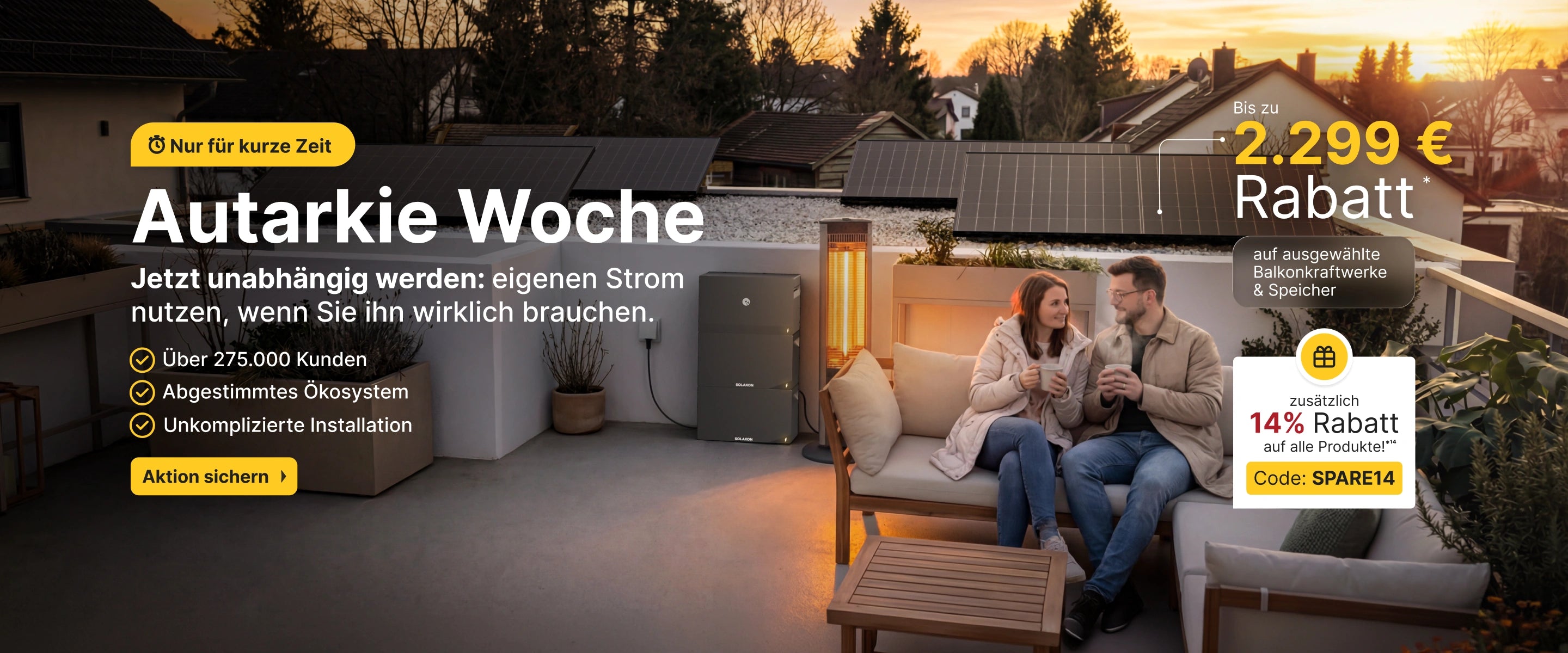 * Pauschaler Preisvorteil gegenüber der Summe der unverbindlichen Preisempfehlungen (UVP) der im Set enthaltenen Einzelkomponenten. Maßgeblich sind die zum Zeitpunkt der Angebotserstellung geltenden UVPs der Einzelkomponenten, abrufbar unter www.solakon.de/collections/zubehoer sowie https://www.solakon.de/collections/speicher.
