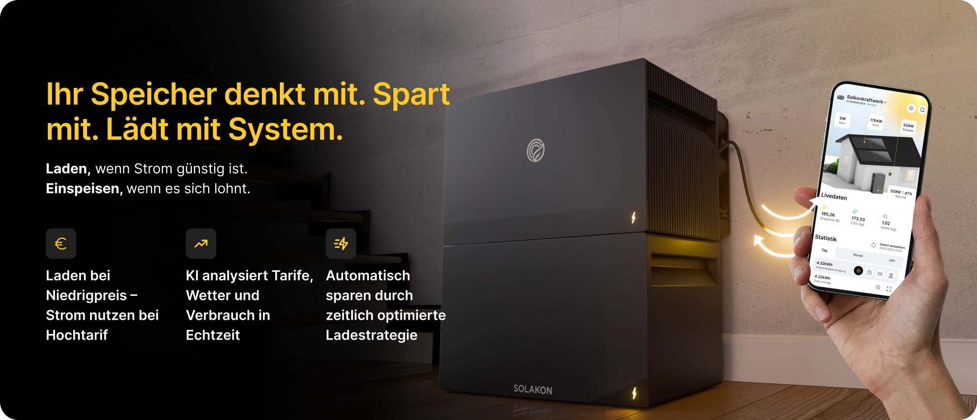 Speichern Sie Ihre Sonnenenergie im Handumdrehen, sparen Sie bares Geld und machen Sie sich unabhängig – mit Solakon ONE, dem ersten in Deutschland für Deutschland entwickelten Speicher der 3. Generation.