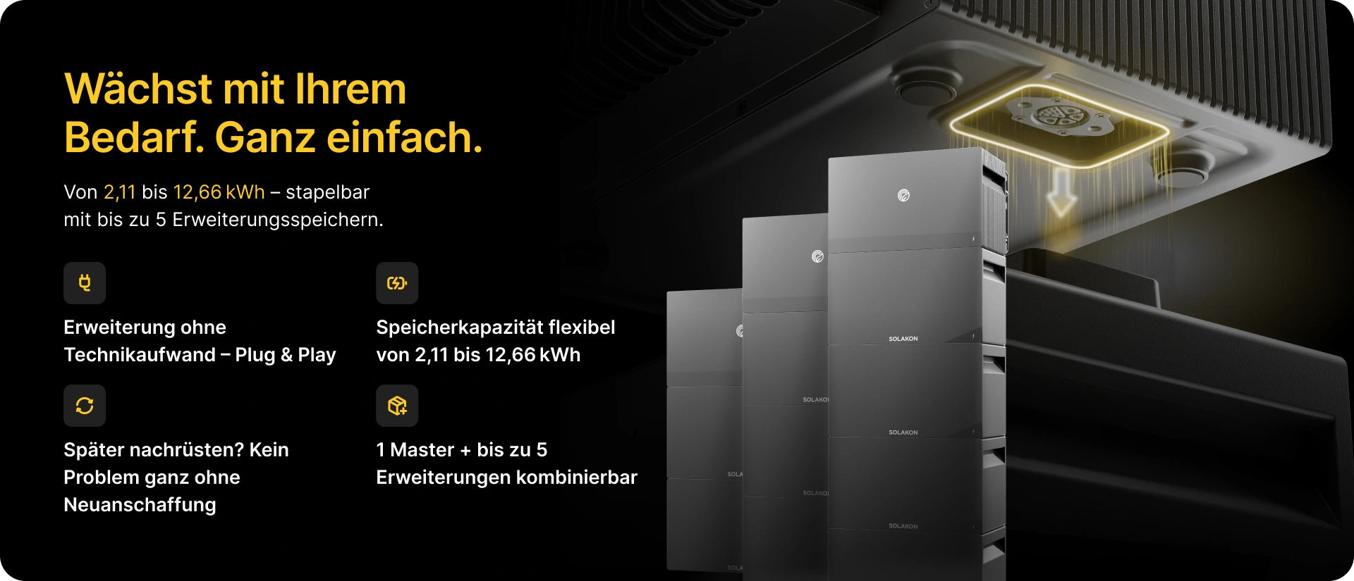 Wir wissen, dass jeder Haushalt einen anderen Energiebedarf hat. Deshalb ist das Speicher-System für Ihr Balkonkraftwerk mit Speicher konsequent modular aufgebaut. Sie haben die Wahl und können mit einer Kapazität von 2,11 kWh beginnen und diese bei Bedarf jederzeit erweitern.
