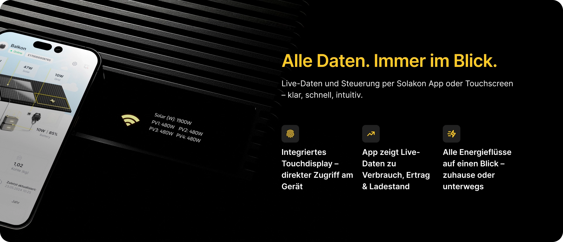 Die Solakon App ist weit mehr als nur eine Anzeige – sie ist Ihr persönliches Cockpit und die Kommandozentrale für Ihr Balkonkraftwerk mit Speicher. Wir haben komplexe Technologie in ein intuitives und benutzerfreundliches Design übersetzt, das Ihnen die volle Kontrolle gibt. Verfolgen Sie live und auf das Watt genau, wie mit den ersten Sonnenstrahlen die Leistung Ihrer Solarmodule ansteigt. Eine animierte Grafik visualisiert den gesamten Energiefluss in Echtzeit: Sehen Sie, wie der Solarstrom über den Wechselrichter direkt in Ihren Haushalt fließt, um Ihre Geräte zu betreiben, oder wie überschüssige Energie genutzt wird, um Ihre Batterie zu laden. Der aktuelle Ladezustand Ihres Speichers wird Ihnen dabei stets präzise in kWh angezeigt – wie eine Tankuhr für Ihre persönliche Solarenergie.