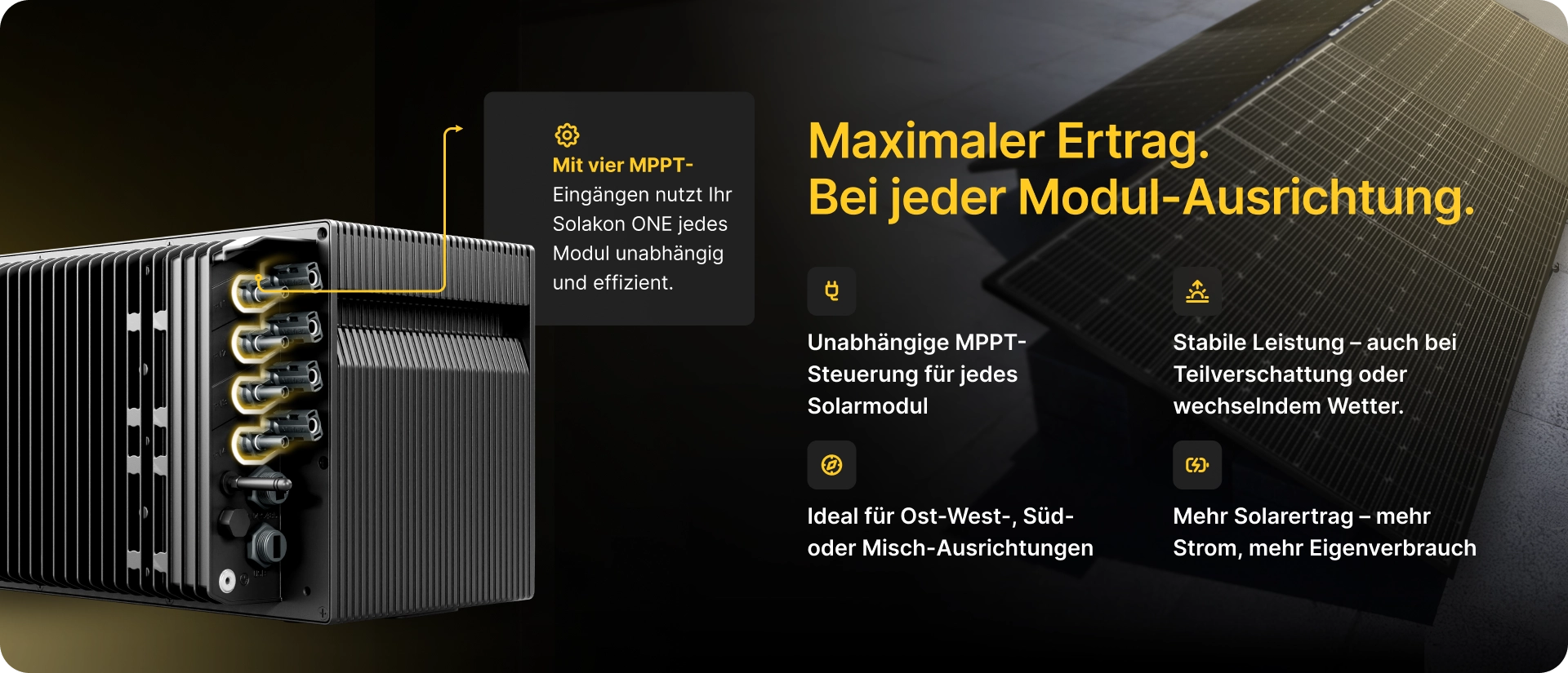 Das onPower Plus Set ist unsere leistungsstärkste Lösung und ideal für Haushalte mit hohem Energiebedarf. Mit acht bifazialen*² Glas-Glas-Modulen erzielt es maximale Erträge. In Kombination mit dem Solakon ONE Speicher ermöglicht es nahezu vollständige Unabhängigkeit vom Stromnetz.