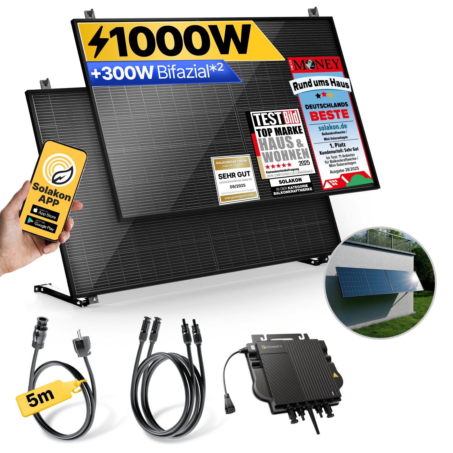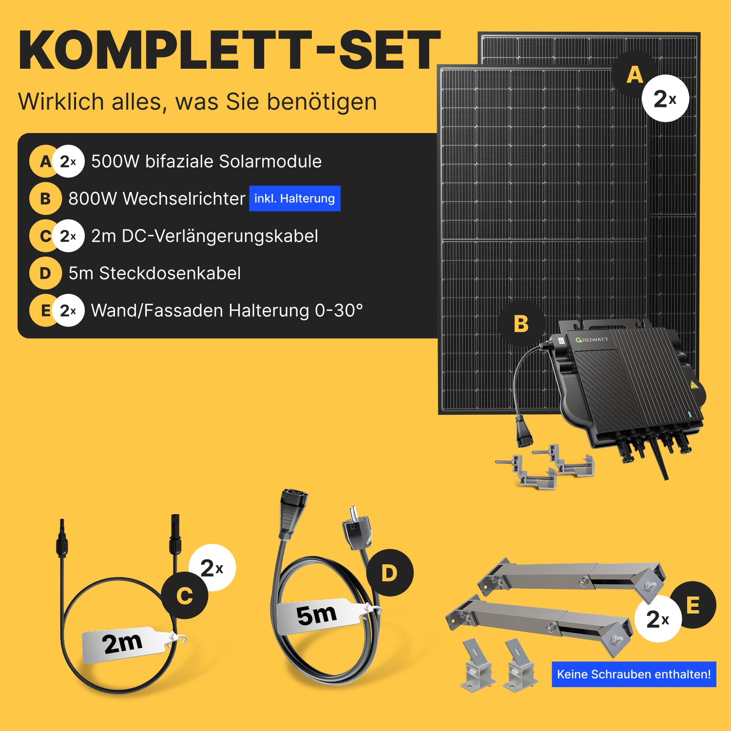 Mit diesem Komplettset erhalten Sie alles, was Sie für einen schnellen, sicheren und ertragreichen Start in Ihre persönliche Energiewende benötigen. Es ist die einfachste Möglichkeit, von der beeindruckenden Leistung eines 1000-Watt-Balkonkraftwerks zu profitieren.