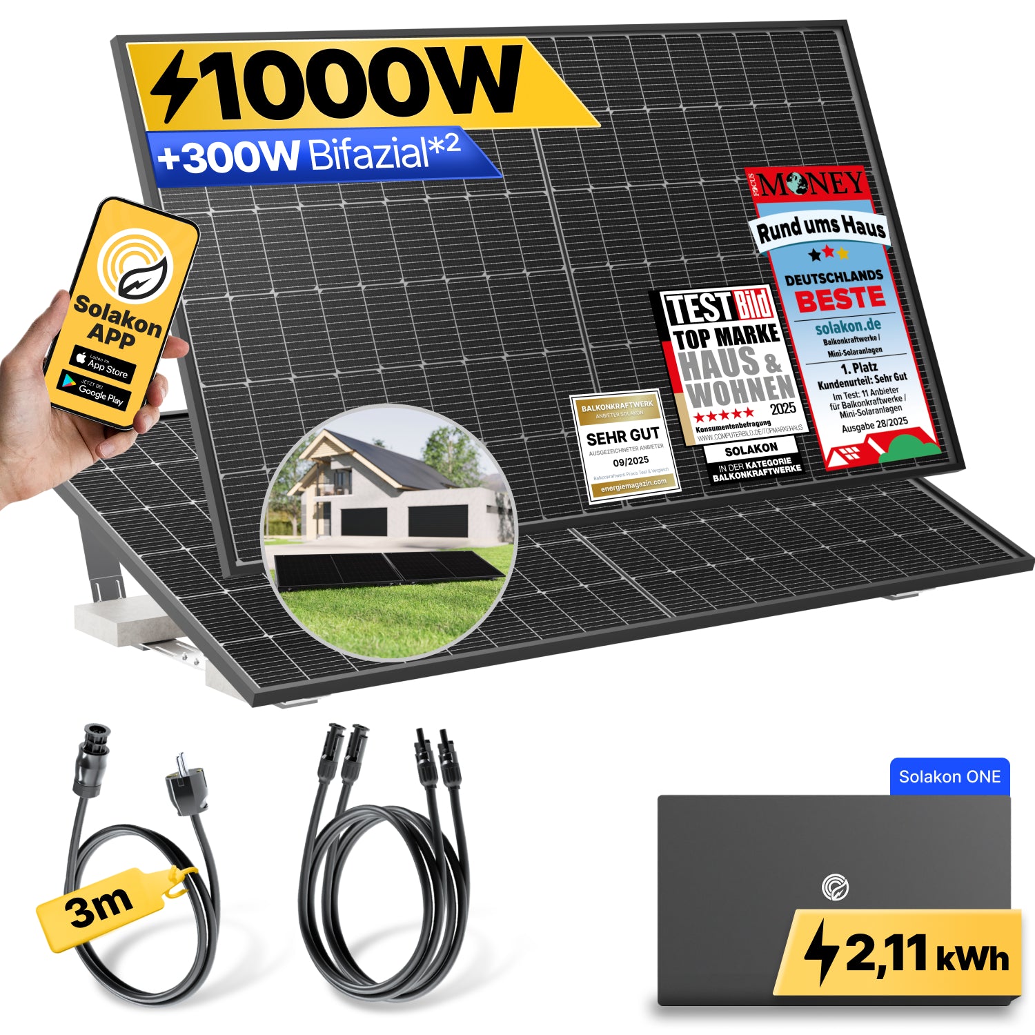 - Zwei hocheffiziente bifaziale*² Solarmodule: Das Herzstück Ihrer Stromerzeugung. Diese Premium-Module nehmen Licht von beiden Seiten auf, was den jährlichen Energie-Ertrag signifikant steigert. Sie sind oft als robuste Glas-Glas-Module ausgeführt, die eine extreme Langlebigkeit garantieren. Zusammen liefern sie eine kraftvolle Modulleistung von ca. 1000 Watt – die perfekte Power-Basis für Ihren Haushalt.