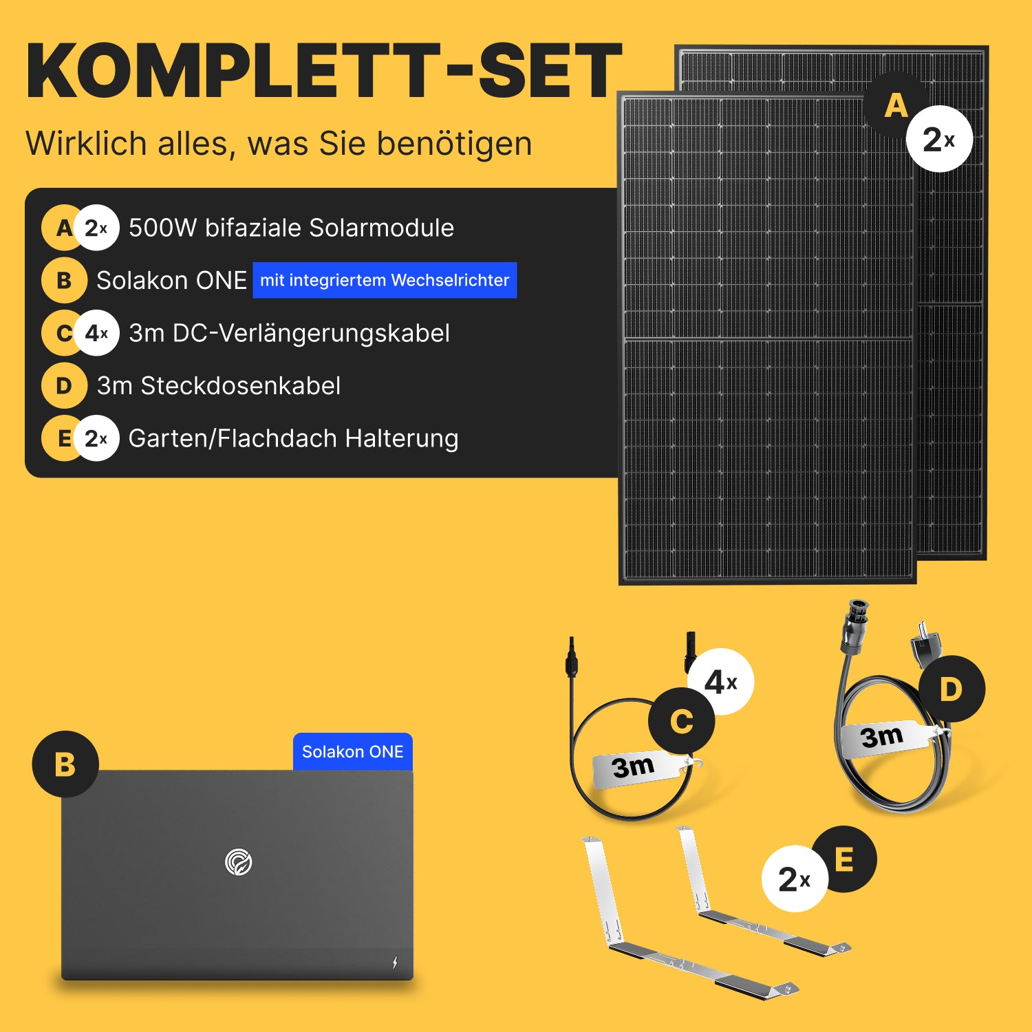 Mit diesem Komplettset erhalten Sie alles, was Sie für einen schnellen, sicheren und ertragreichen Start in Ihre persönliche Energiewende benötigen. Es ist die einfachste Möglichkeit, von der beeindruckenden Leistung eines 1000-Watt-Balkonkraftwerks zu profitieren.