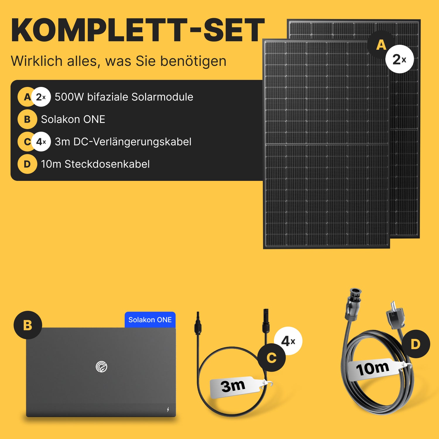 Mit diesem Komplettset erhalten Sie alles, was Sie für einen schnellen, sicheren und ertragreichen Start in Ihre persönliche Energiewende benötigen. Es ist die einfachste Möglichkeit, von der beeindruckenden Leistung eines 1000-Watt-Balkonkraftwerks zu profitieren.