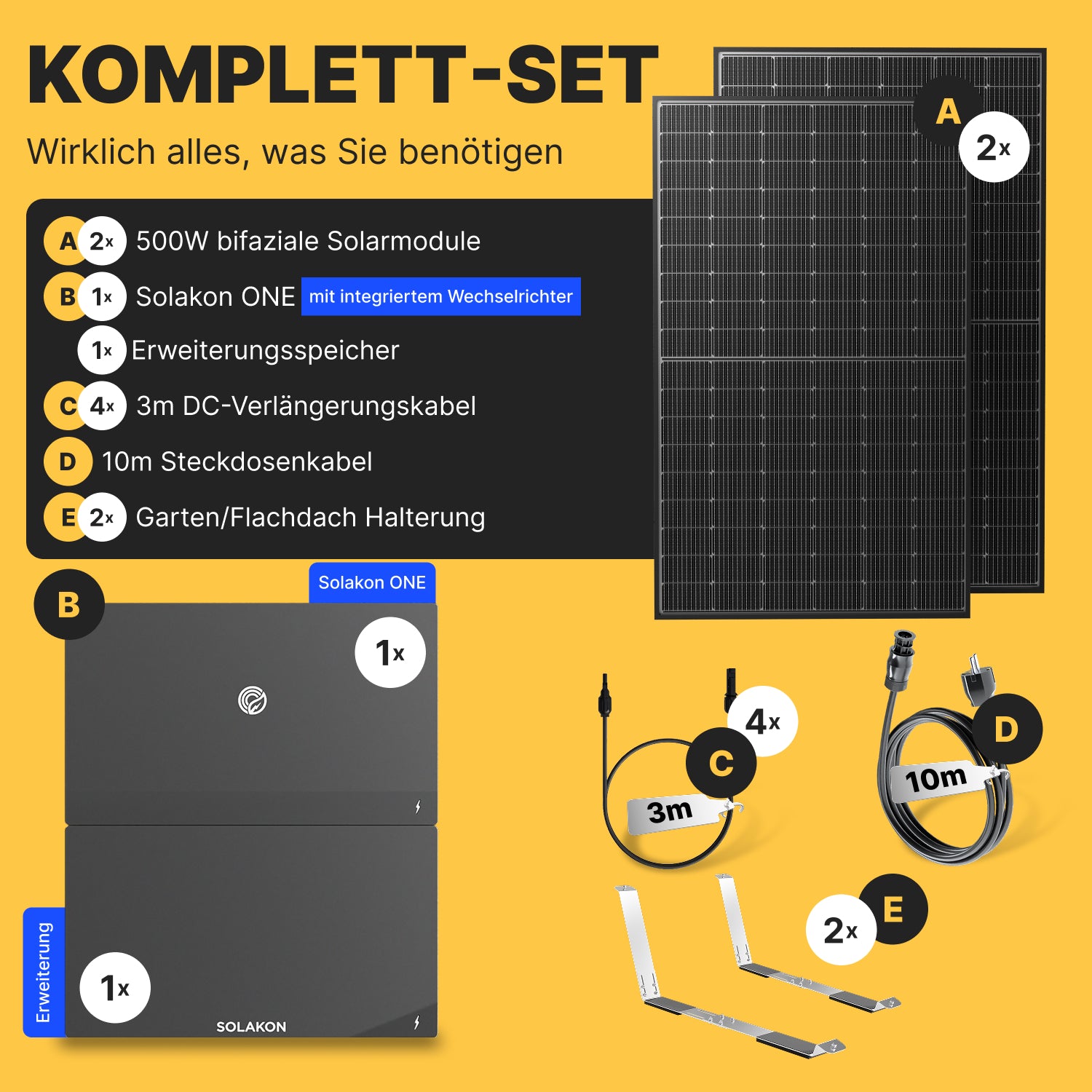 Mit diesem Komplettset erhalten Sie alles, was Sie für einen schnellen, sicheren und ertragreichen Start in Ihre persönliche Energiewende benötigen. Es ist die einfachste Möglichkeit, von der beeindruckenden Leistung eines 1000-Watt-Balkonkraftwerks zu profitieren.