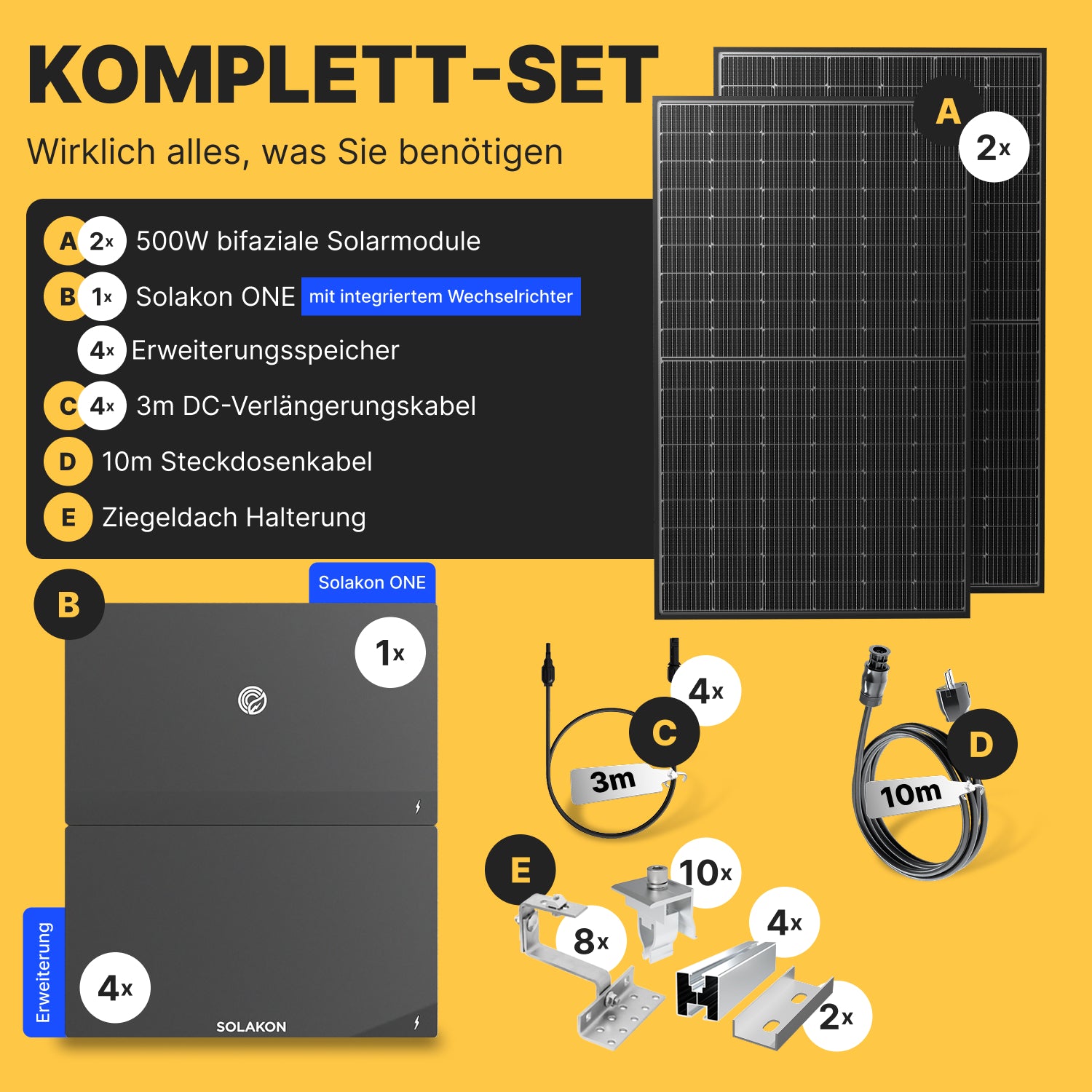 * Pauschaler Preisvorteil gegenüber der Summe der unverbindlichen Preisempfehlungen (UVP) der im Set enthaltenen Einzelkomponenten. Maßgeblich sind die zum Zeitpunkt der Angebotserstellung geltenden UVPs der Einzelkomponenten, abrufbar unter www.solakon.de/collections/zubehoer sowie https://www.solakon.de/collections/speicher.