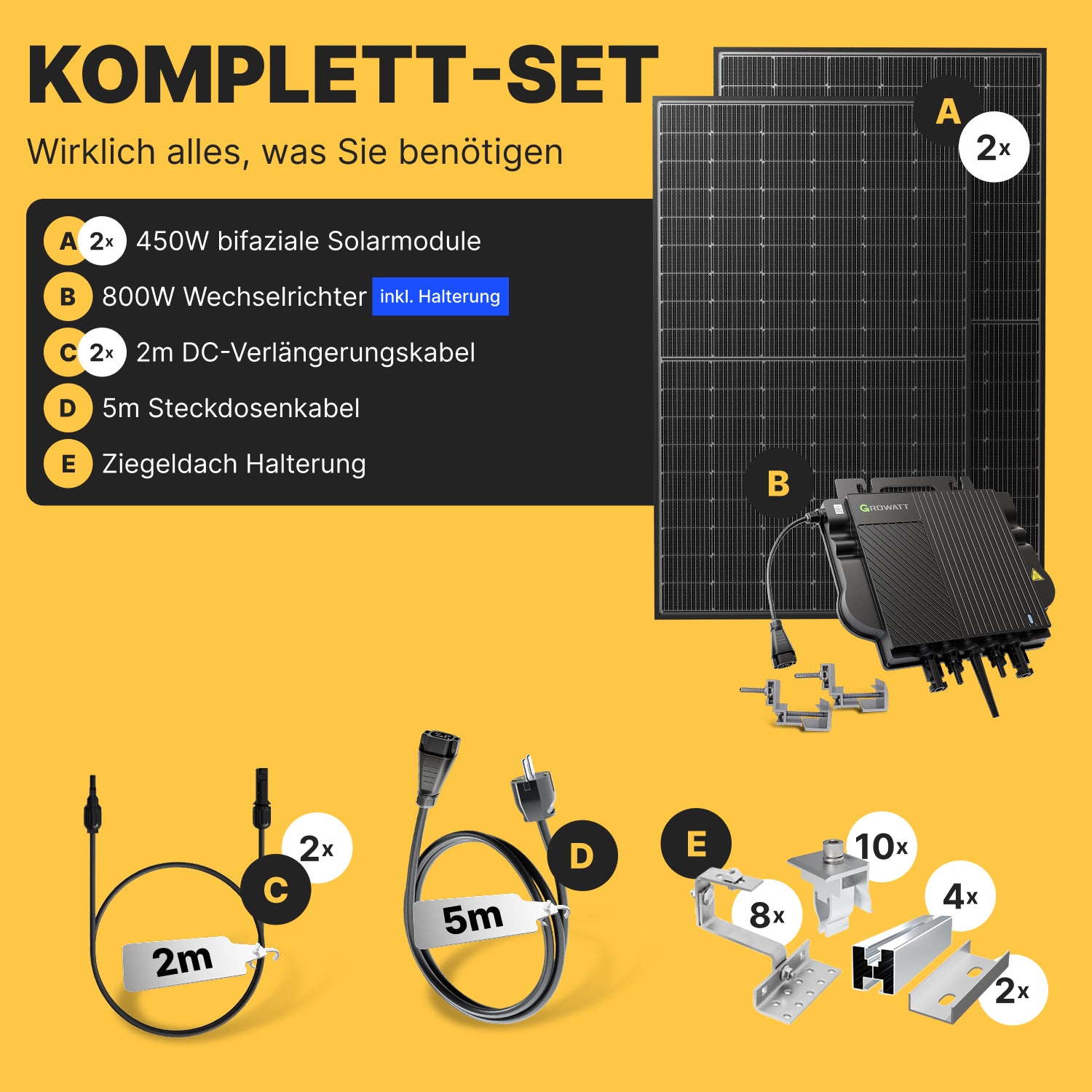 • Die Verbindung - Alle nötigen Anschlusskabel & Stecker: Vom Solarkabel bis zum Anschlusskabel mit Schutzkontakt-Stecker für die Steckdose ist alles enthalten. Sie können sofort mit der Montage beginnen.