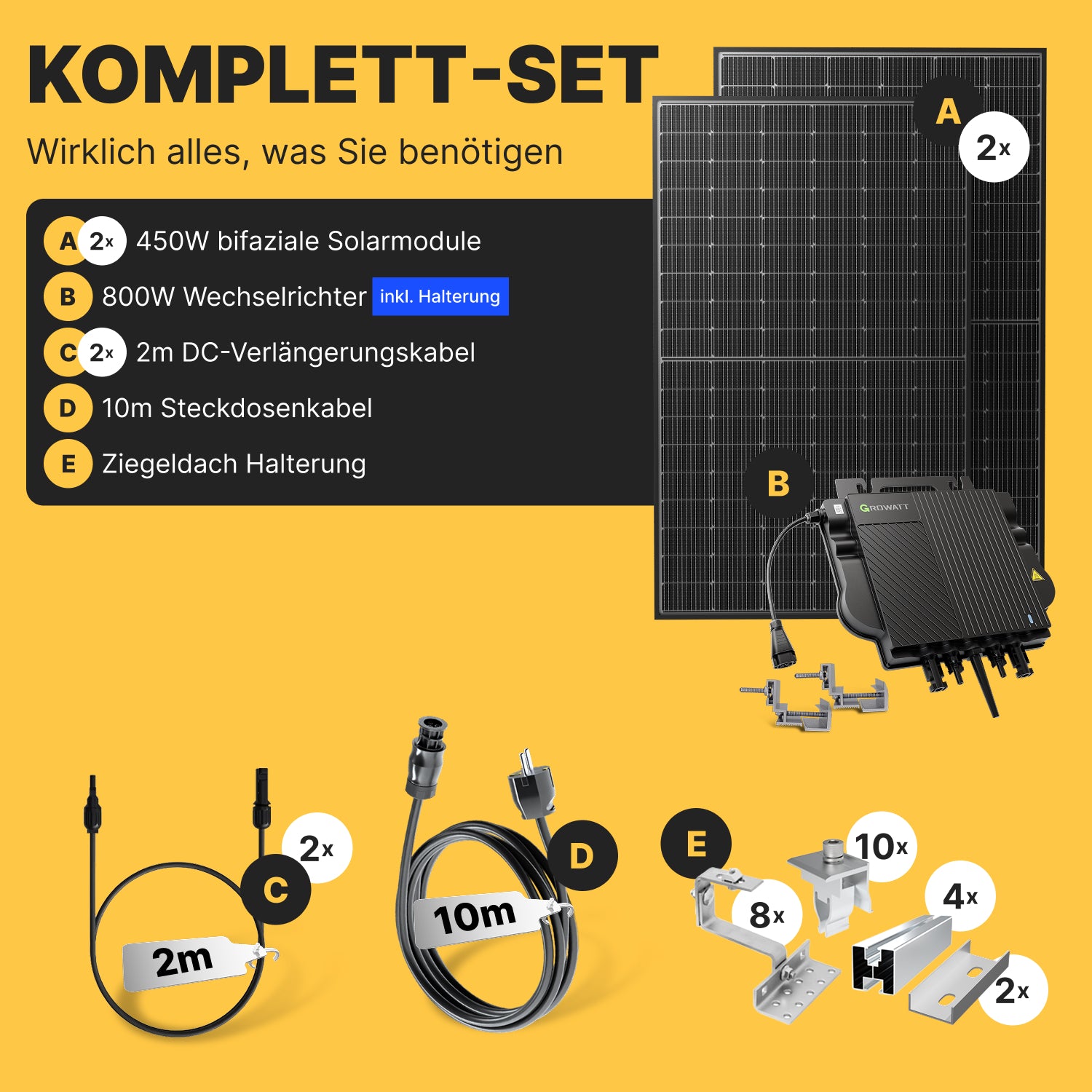 - Die Verbindung - Alle nötigen Anschlusskabel & Stecker: Vom Solarkabel bis zum Anschlusskabel mit Schutzkontakt-Stecker für die Steckdose ist alles enthalten. Sie können sofort mit der Montage beginnen.