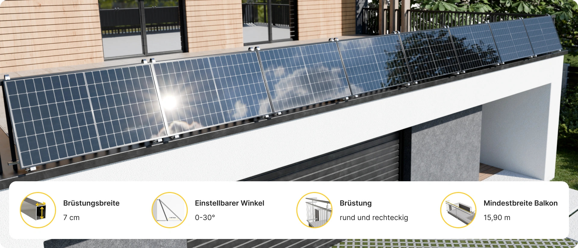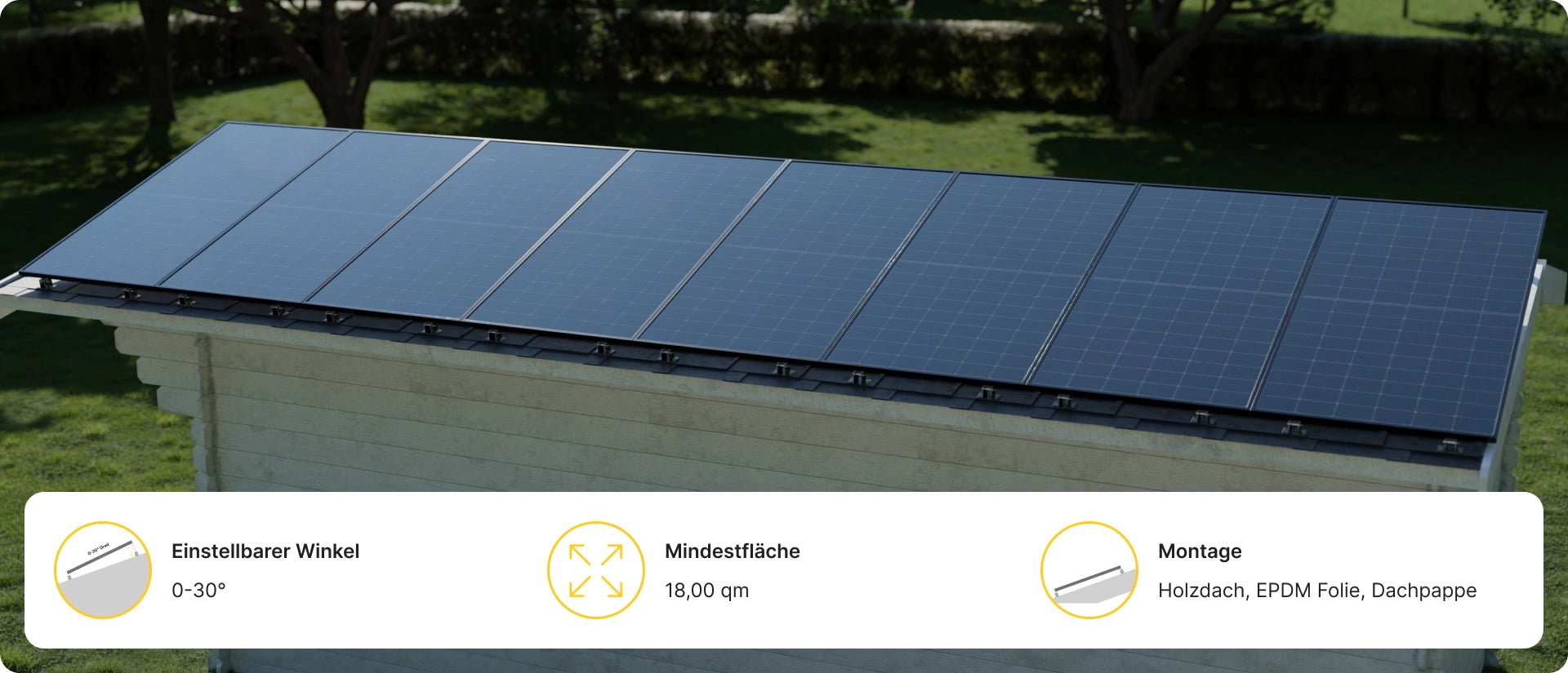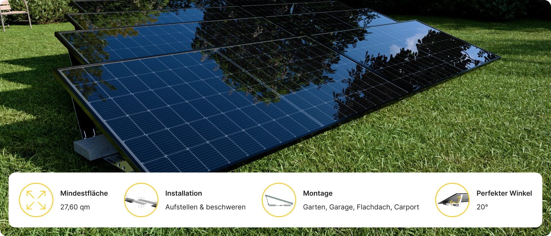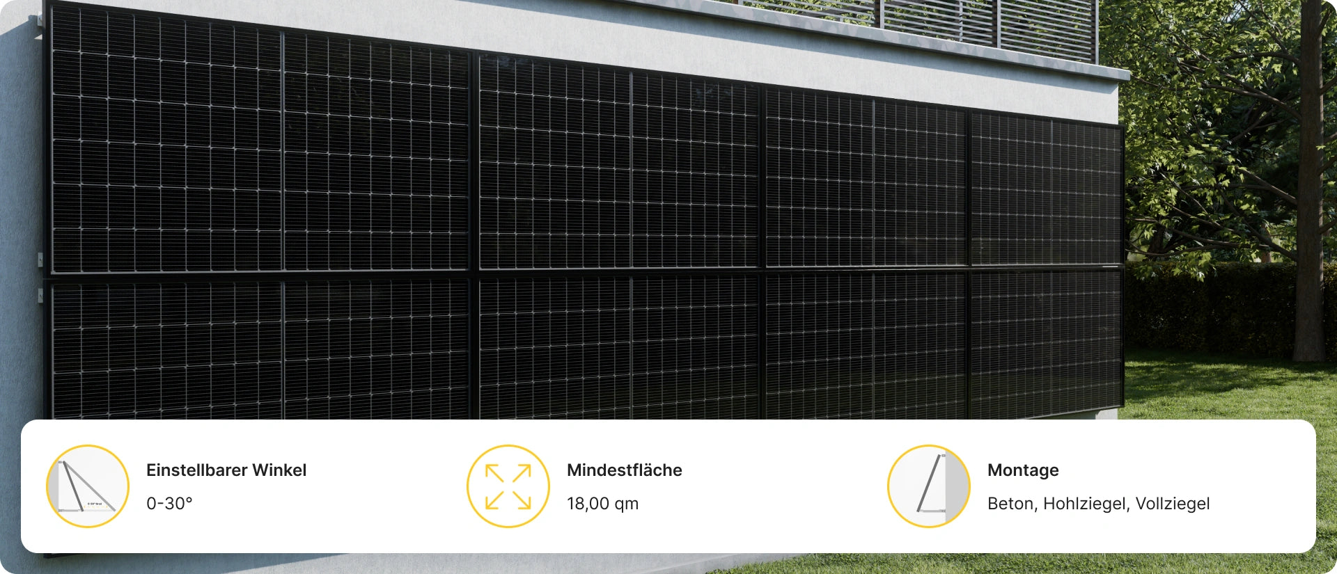 - Optionale Halterungen - Sichere Montage: Obwohl die Solaranlage als Komplettset geliefert wird, sind passende Halterungen für eine sichere Aufständerung oder Montage an der Fassade entscheidend. Die Art der Halterung hängt von Ihrem Installationsort ab und ist so konzipiert, das höhere Gewicht und die Windlast der acht Module sicher zu tragen.