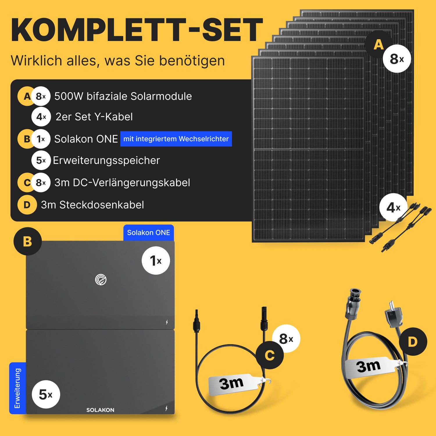 Für eine 4000-Watt-Anlage wird ein Speicher mit 6–8 kWh Kapazität empfohlen. Sprich 1 Solakon ONE mit 3 Erweiterungsspeichern.