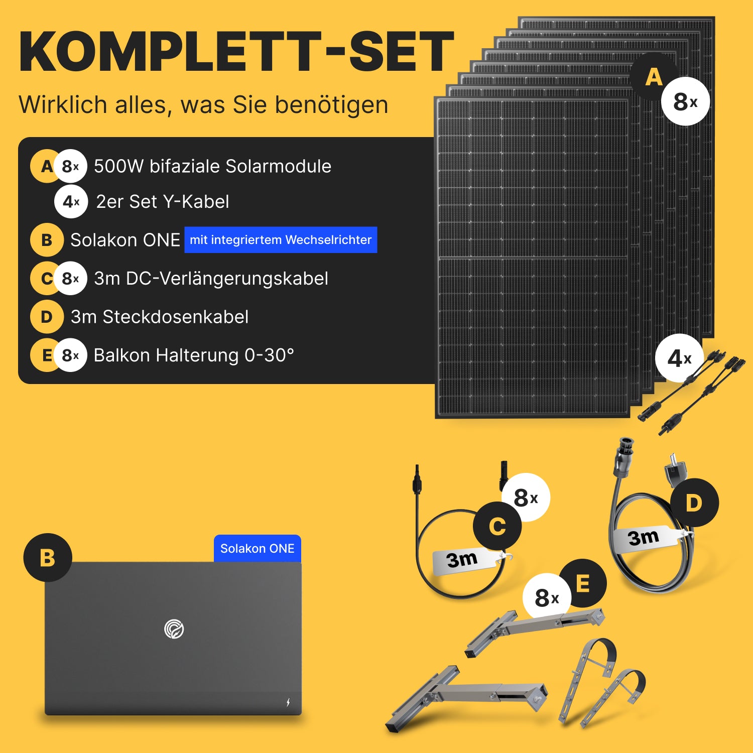 Das Komplettset für unser Balkonkraftwerk mit 4000 Watt ist eine Rundum-Sorglos-Lösung. Es enthält alle wichtigen Komponenten für eine einfache Installation. Im Set finden Sie acht Premium-bifaziale*² Glas-Glas-Solarmodule (Gesamt-Modulleistung ca. 4000 Watt), den darauf abgestimmten 800-Watt-Wechselrichter, sowie alle notwendigen Anschlusskabel mit MC4-Steckern und ein Kabel für den Anschluss an die Steckdose. Sie erhalten alles, um Ihr High-Performance-Kraftwerk sofort in Betrieb zu nehmen.