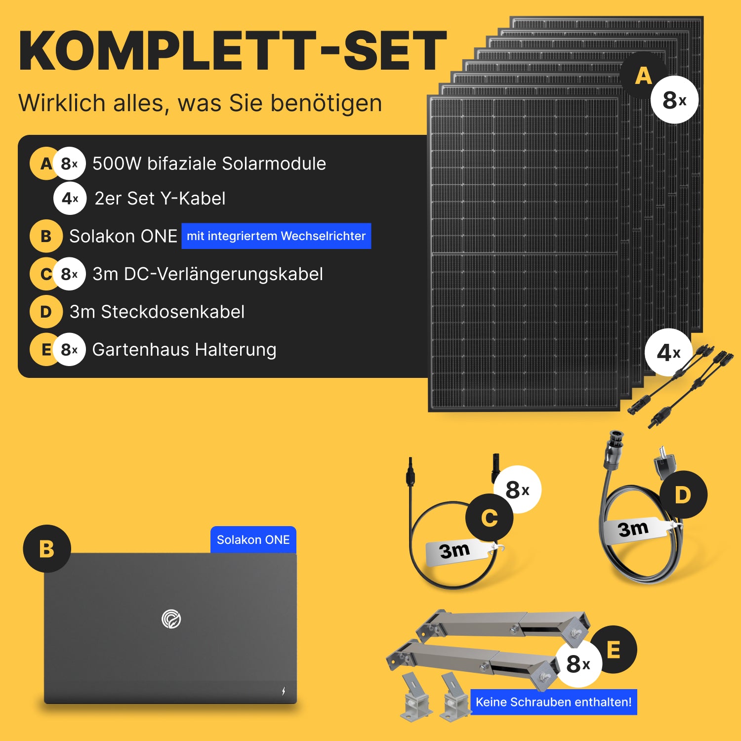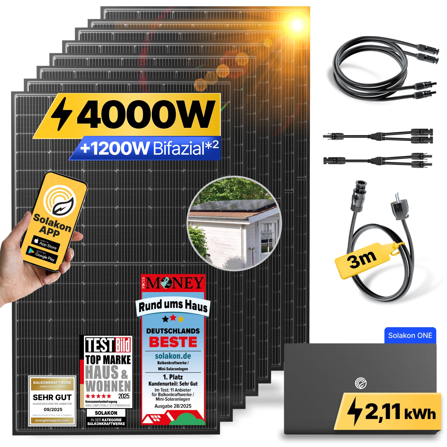 Das Komplettset für unser Balkonkraftwerk mit 4000 Watt ist eine Rundum-Sorglos-Lösung. Es enthält alle wichtigen Komponenten für eine einfache Installation. Im Set finden Sie acht Premium-bifaziale*² Glas-Glas-Solarmodule (Gesamt-Modulleistung ca. 4000 Watt), den darauf abgestimmten 800-Watt-Wechselrichter, sowie alle notwendigen Anschlusskabel mit MC4-Steckern und ein Kabel für den Anschluss an die Steckdose. Sie erhalten alles, um Ihr High-Performance-Kraftwerk sofort in Betrieb zu nehmen.