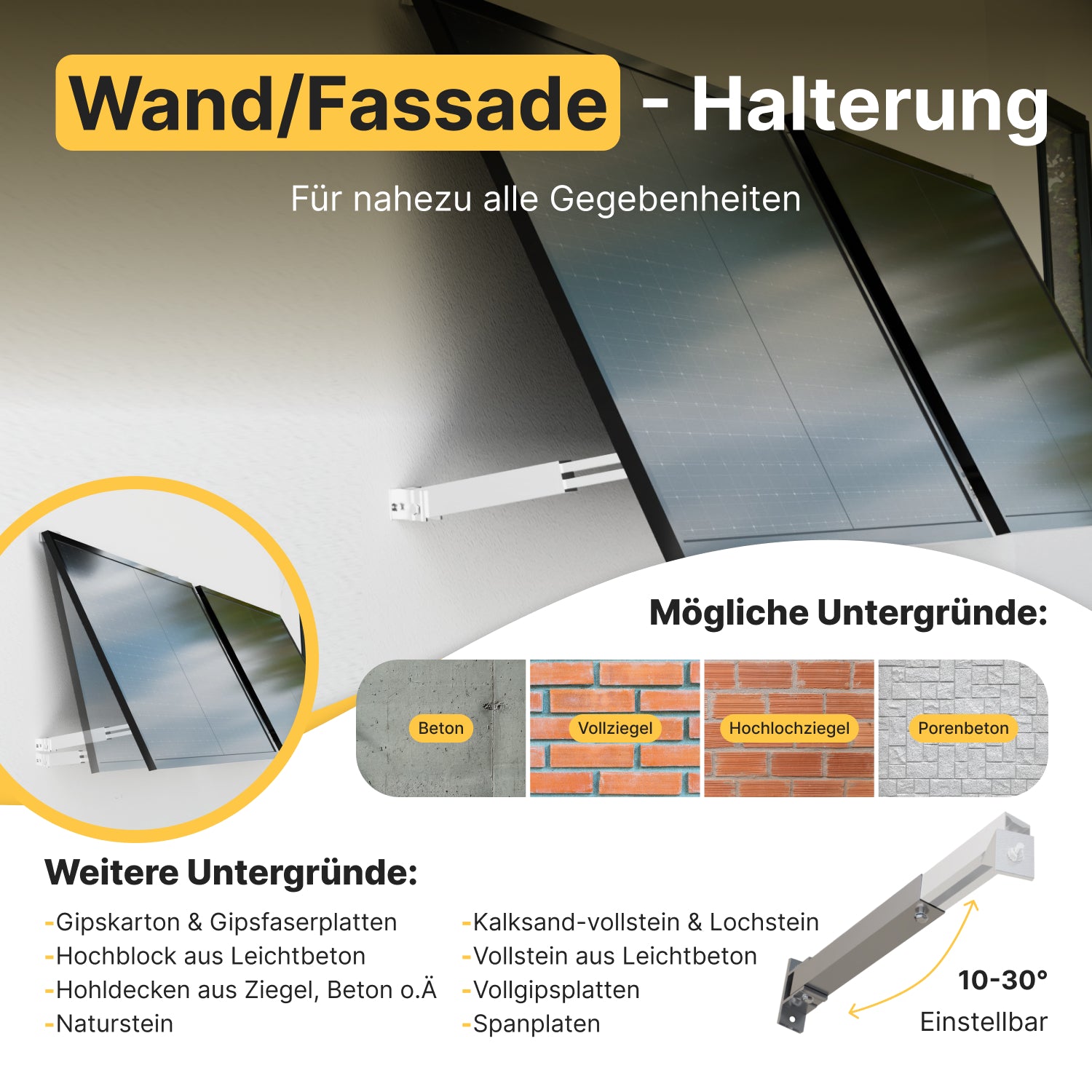 Die Installation eines 2000 Watt Balkonkraftwerks unterscheidet sich im Prinzip nicht von der einer kleineren Anlage, da auch hier der Anschluss einfach über eine Steckdose erfolgt. Die wichtigsten Vorkehrungen betreffen die Statik und den Platzbedarf. Da die Anlage aus vier Solarmodulen besteht, benötigen Sie eine ausreichend große und tragfähige Fläche, sei es auf einem Dach, an der Fassade oder im Garten. Die von uns angebotenen Halterungen sind für das höhere Gewicht und die Windlast von vier Modulen ausgelegt und gewährleisten eine sichere Montage. Elektrisch ist alles unkompliziert: Die Module werden mit dem Wechselrichter verbunden und dieser wird an eine geeignete, wetterfeste Steckdose angeschlossen. Eine spezielle Genehmigung oder ein Starkstromanschluss sind nicht erforderlich.