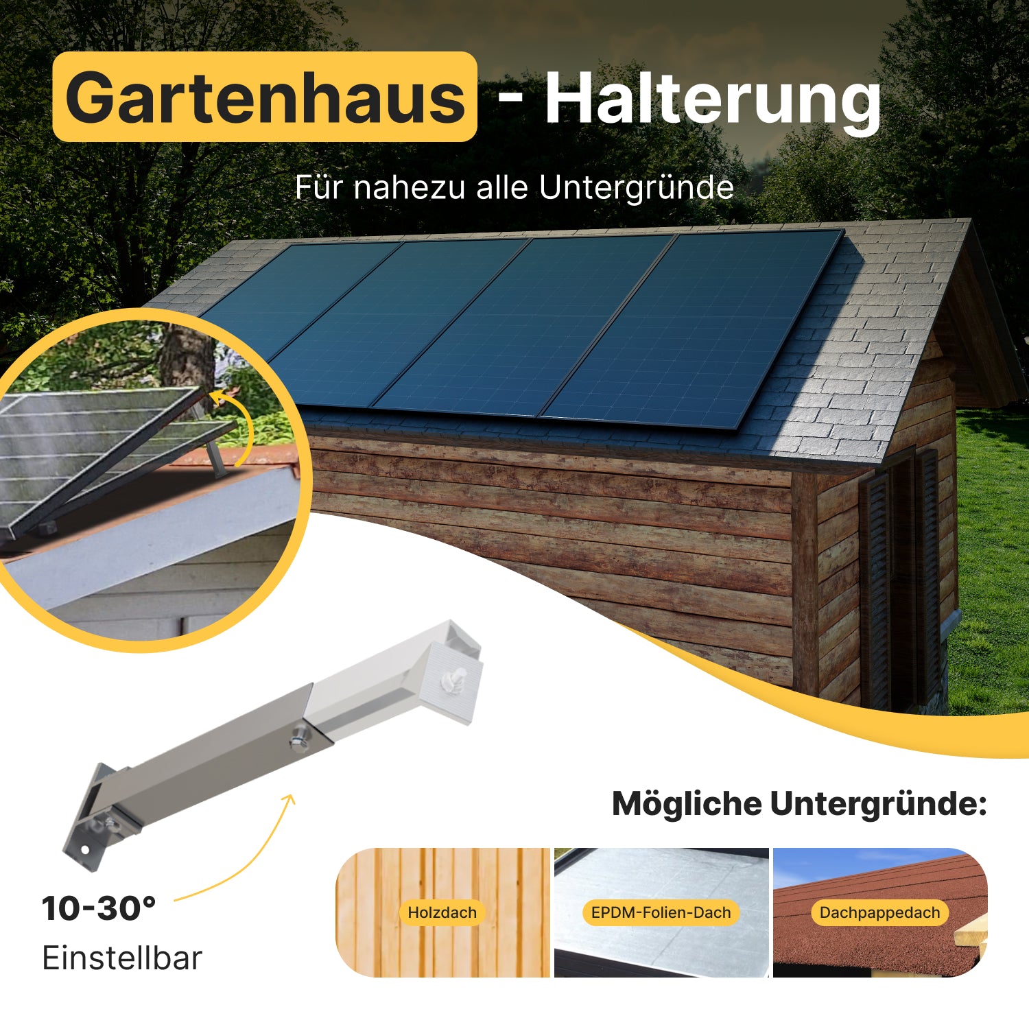 Wir bieten derzeit Halterungen für verschiedene Einsatzbereiche an: für den Garten oder das Flachdach, für den Balkon, die Wand oder Fassade, die Gartenhütte und das Ziegeldach. Bei der Halterung für das Ziegeldach haben Sie die Wahl zwischen einer Einzelmontage (2 PV-Module können an separaten Stellen montiert werden) oder einer Paarmontage (2 PV-Module werden nebeneinander montiert).