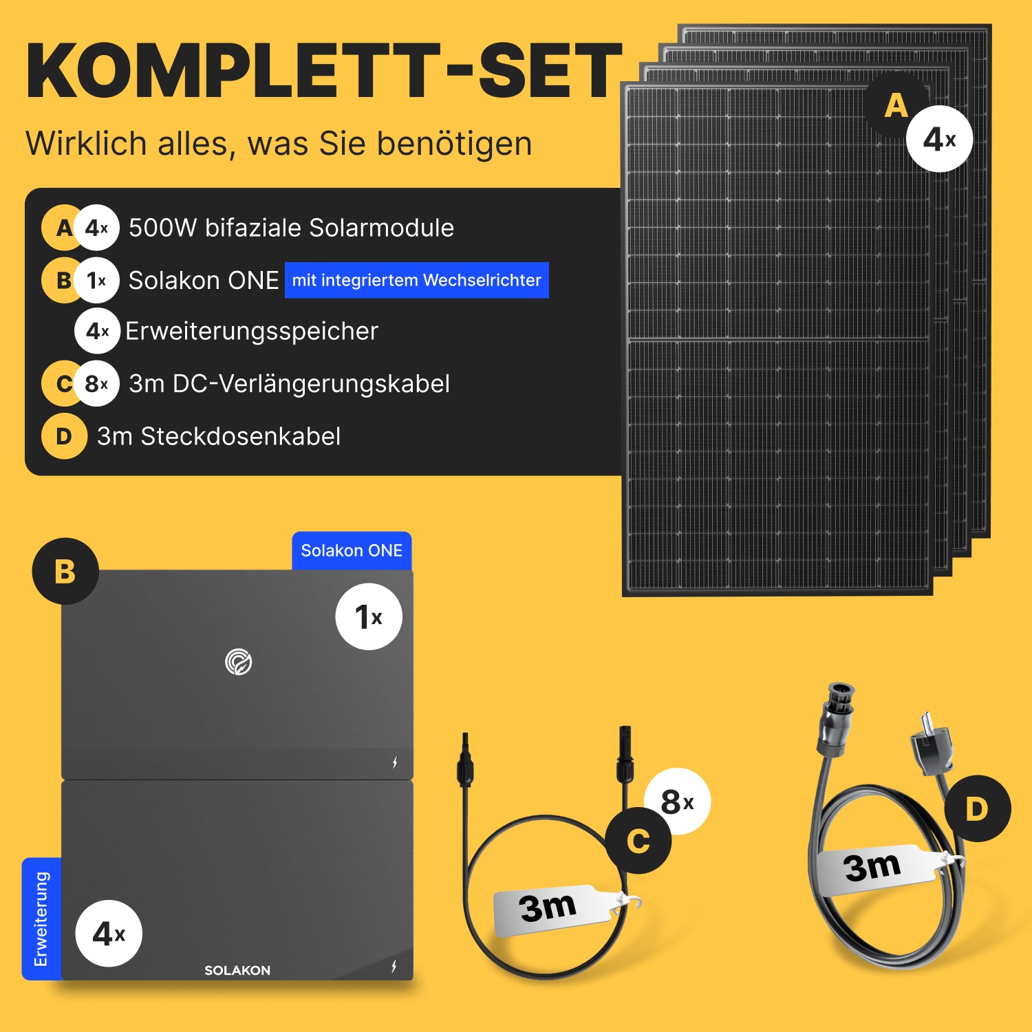 * Pauschaler Preisvorteil gegenüber der Summe der unverbindlichen Preisempfehlungen (UVP) der im Set enthaltenen Einzelkomponenten. Maßgeblich sind die zum Zeitpunkt der Angebotserstellung geltenden UVPs der Einzelkomponenten, abrufbar unter www.solakon.de/collections/zubehoer sowie https://www.solakon.de/collections/speicher.