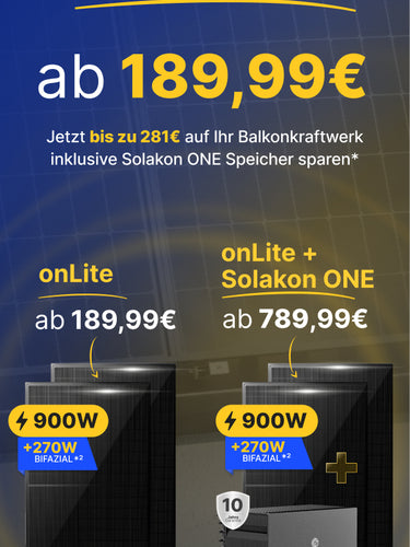 * Pauschaler Preisvorteil gegenüber der Summe der unverbindlichen Preisempfehlungen (UVP) der im Set enthaltenen Einzelkomponenten. Maßgeblich sind die zum Zeitpunkt der Angebotserstellung geltenden UVPs der Einzelkomponenten, abrufbar unter www.solakon.de/collections/zubehoer sowie https://www.solakon.de/collections/speicher.